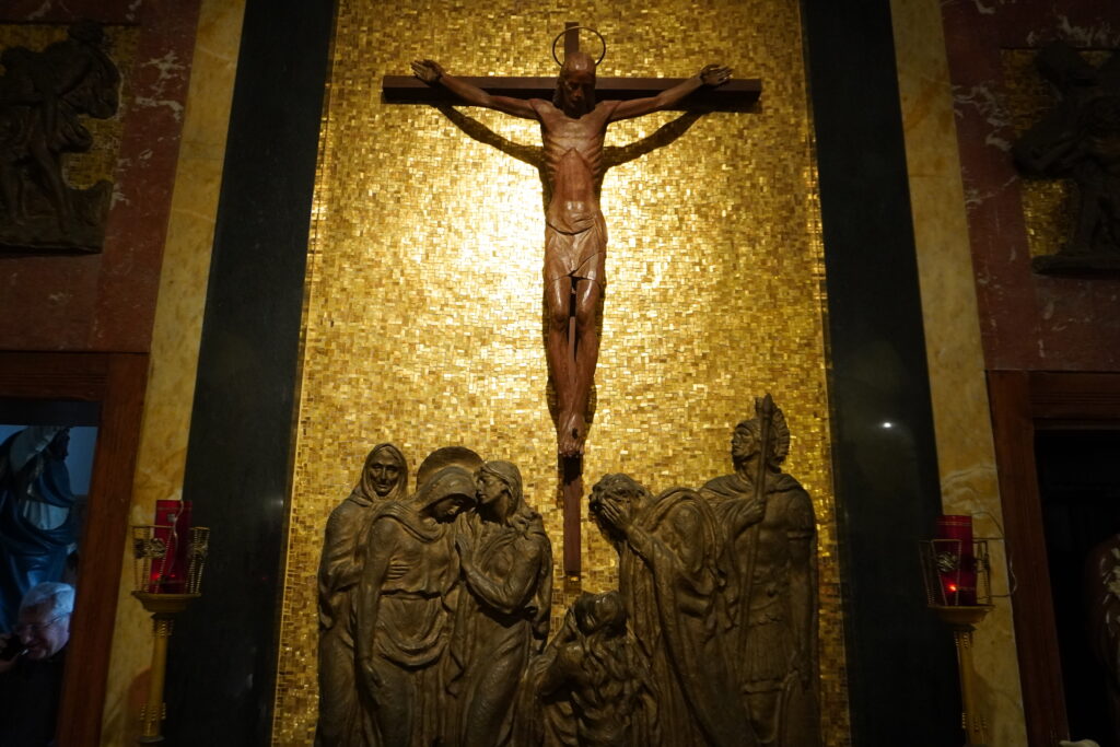 Il grande crocifisso è posto in mezzo ad un’altra opera d’arte in bronzo di Paolo Panetta raffigurante il “Pianto delle Maria”.